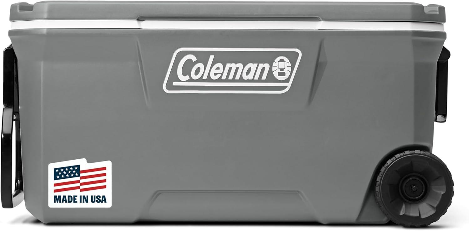 Coleman Classic Series Insulated Portable Rolling Cooler with Wheels, Leak-Resistant Outdoor Hard Cooler Keeps Ice up to 5 Days, 100-Quart(Rock Grey)