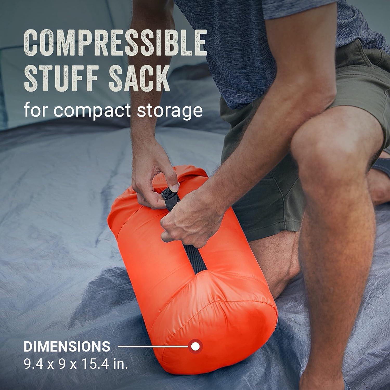 COMPRESSIBLE STUFF SACK: With side straps that can be cinched to compress the bag; compact size packs up smaller than traditional Coleman sleeping bags (9.4 x 9 x 15.4 in.)