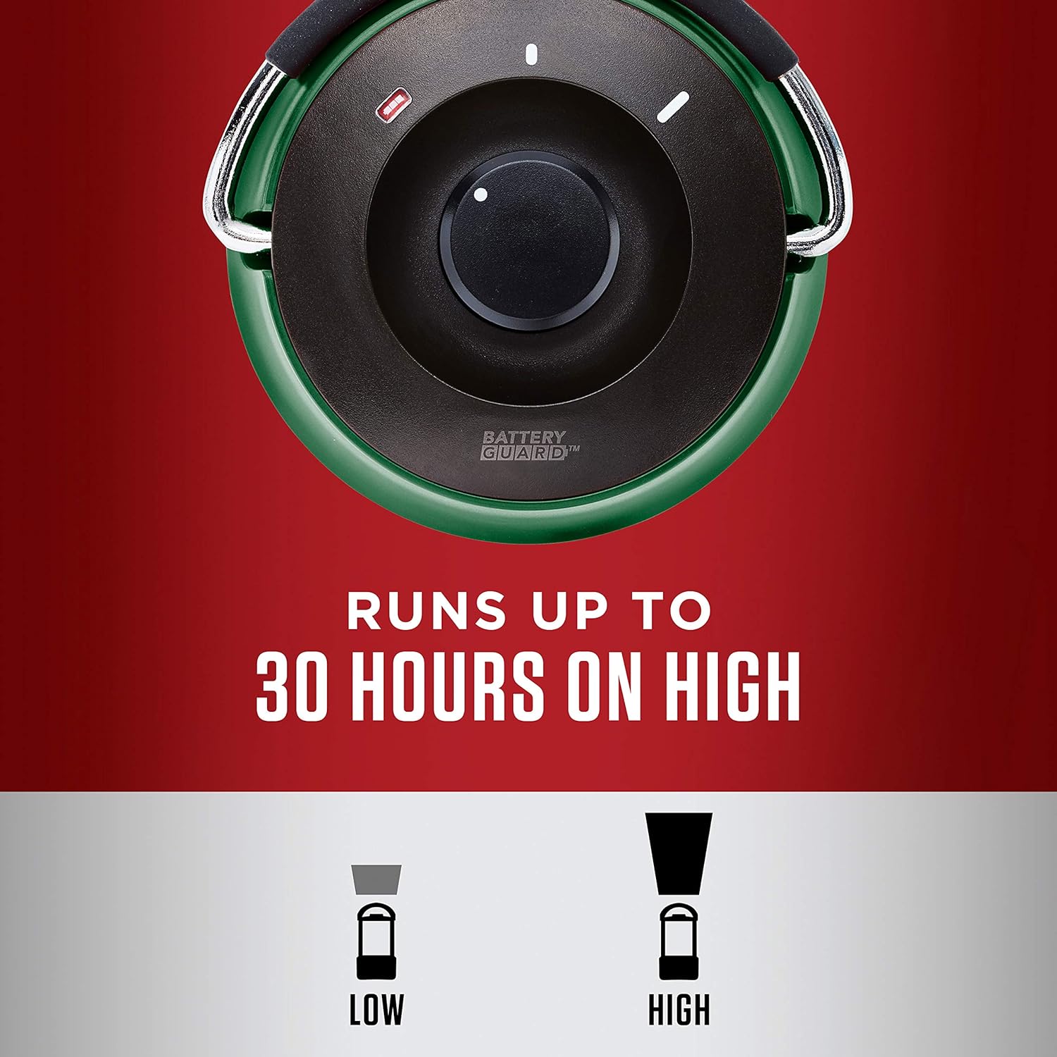 The Coleman 1000 Lumens LED Lantern with Battery Guard stops battery drain so you'll have power when you need it most. Conventional battery-operated lanterns experience residual power drain as long as batteries are connected to the circuit, even when the device is turned off. With Battery Guard, the batteries are automatically disengaged from the circuit when the lantern is switched off to extend their life by as much as 25%. This technology also reduces the chance of damaging corrosion so batteries can be stored in the device for years (up to their inherent shelf life). Additional features include a rotating dial to easily switch between high, medium, low, and flashing modes, up to 14 hours runtime on high using 4 D batteries (sold separately), water resistance, impact resistance up to 2 meters (on dirt), and lifetime LED bulbs that never need replacing. No matter the situation, from power outages to roadside emergencies, this Battery Guard lantern with a 16-meter beam gives you Power When You Need It.