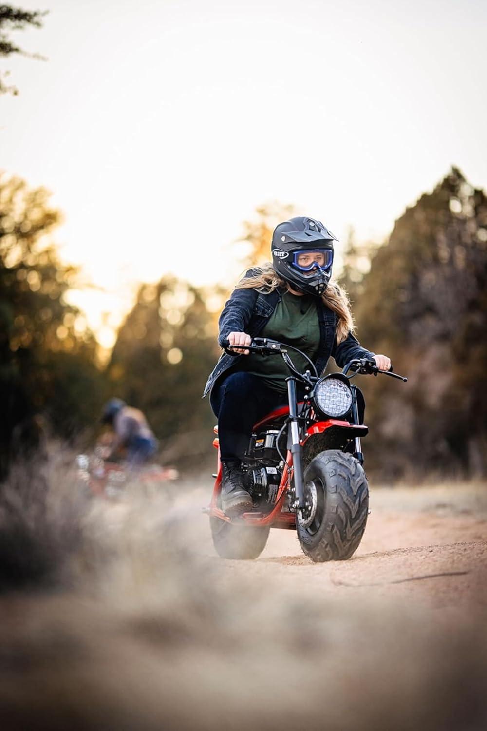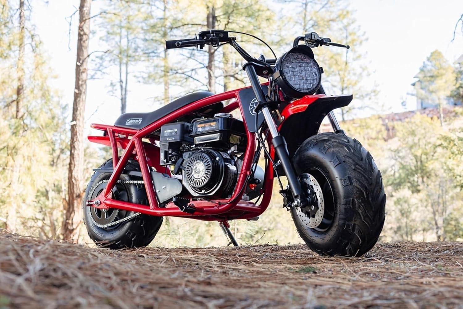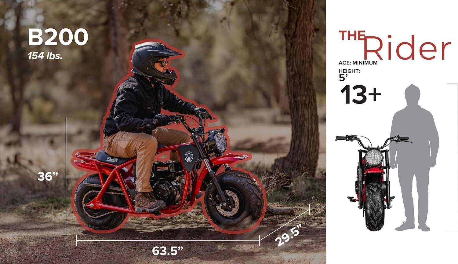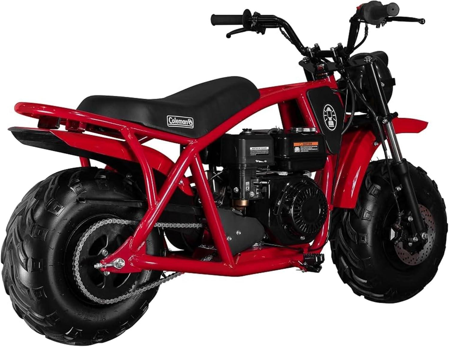 The Coleman 196cc Minibike B200 crafted for both kids and adults is designed to conquer the toughest terrains while ensuring a smooth and exhilarating ride. The B200 gas powered mini bike boasts a powerful 196cc, air-cooled, OHV, 4-stroke engine, the air-cooled system effectively dissipates heat, maintaining optimal engine performance. The OHV design enhances fuel efficiency and power output. Mini bike constructed from heavy duty metal frame guarantees long-lasting reliability. Low-pressure tires and a double shock absorber suspension system ensure stability and safety. The low-pressure tires provide excellent traction and cushioning, absorbing bumps on uneven surfaces. This double shock absorber enhances the riding experience by minimizing vibrations and shocks. The minibike features an easy pull-start mechanism for quick and effortless starts. The minibike also includes a bright headlight, improving visibility and safety during night rides or in low-light conditions. The ergonomic design of the handlebars and seat ensures a comfortable riding position. With a high load capacity of up to 200 lbs, the Coleman B200 mini dirt bike is suitable for young riders or adults seeking off-road excitement, this minibike offers the durability and power needed for an unforgettable adventure.