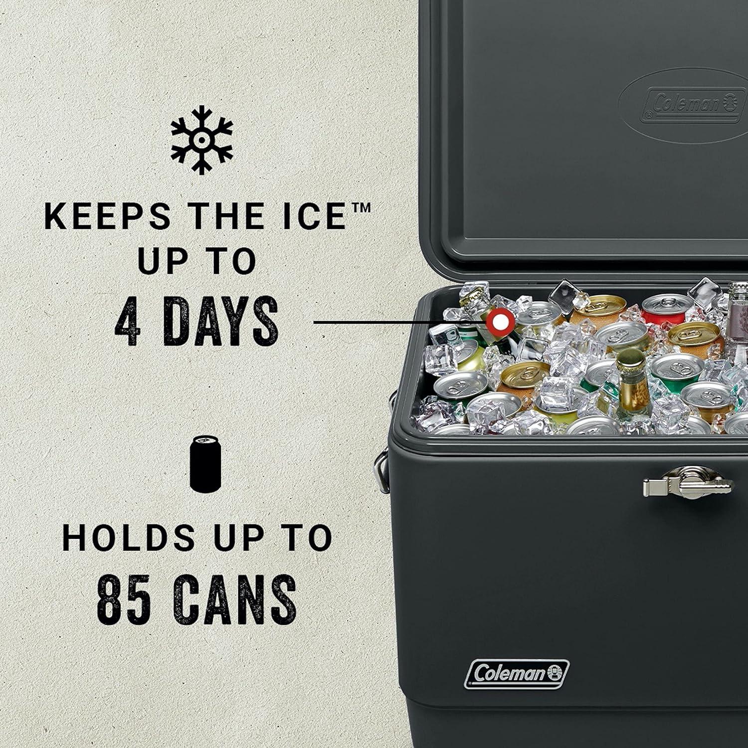 This modern, matte powder-coated finish cooler by Coleman stands out in any setting. Our 54qt steel belted, portable cooler combines sturdy steel construction with a leak-resistant design for lasting durability. Tailored for portability, it features comfort-grip steel handles for easy lifting and carrying. Our cooler's Have-A-Seat lid doubles as a seat, supporting up to 250 lbs. It's perfect for tailgating with a built-in bottle opener for easy refreshment access. Offering a large capacity, our cooler holds up to 85 cans and keeps ice intact for up to 4 days.