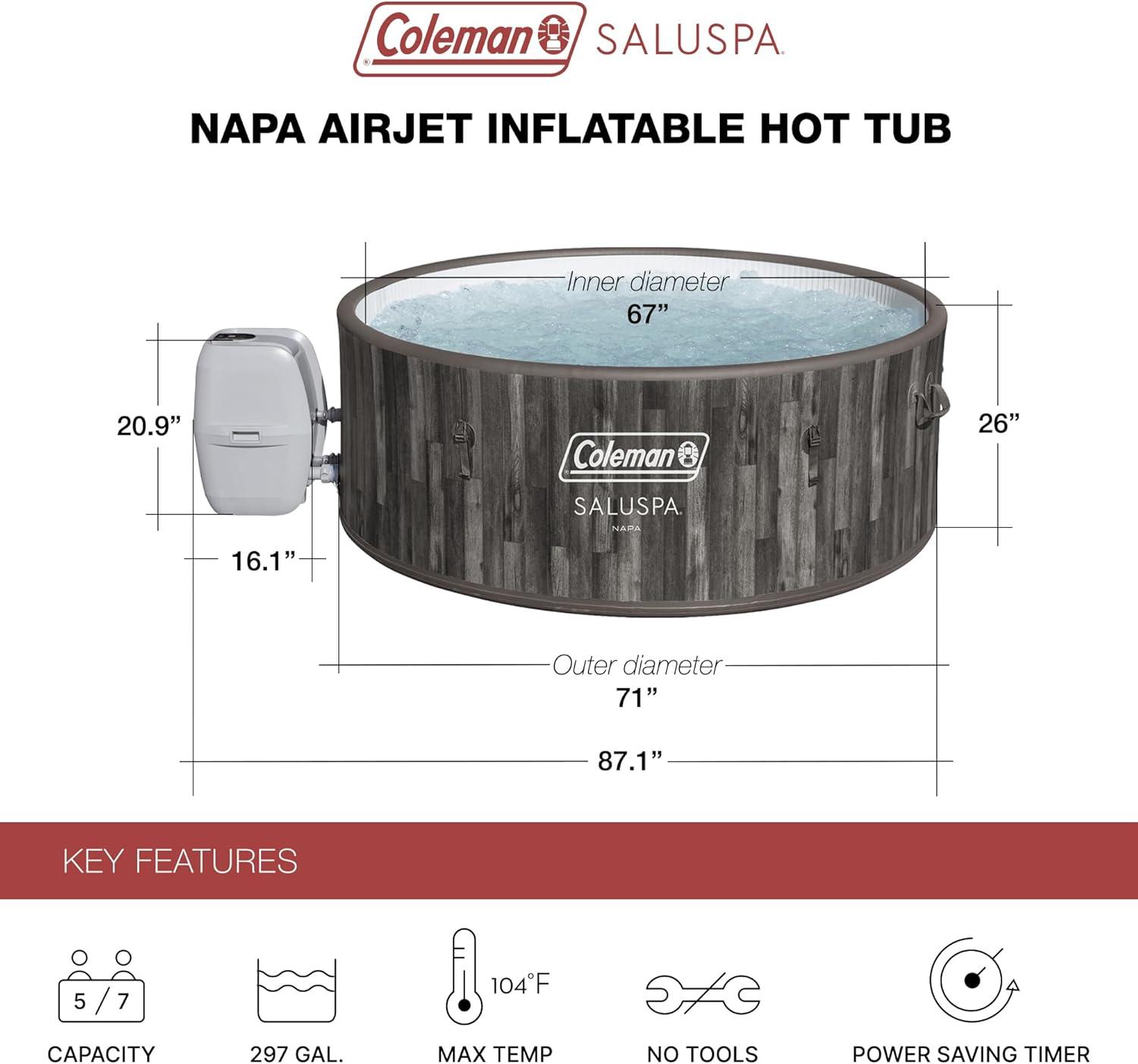 SALUSPA AIRJET HOT TUB: SaluSpa Napa AirJet hot tub provides a soothing massage experience with 180 bubbling warm jets for up to 7 people while reaching up to 104 degrees Fahrenheit for ultimate relaxation