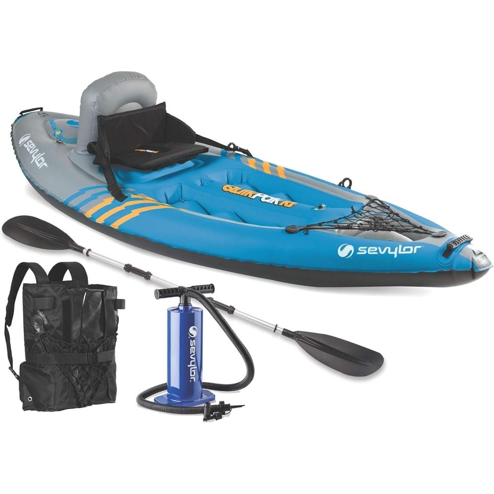 Hit the water in as little as five minutes with the Sevylor® Quikpakâ„¢ K1 1-Person Kayak, where getting to your next trek is as easy as backpack – unpack – kayak. The innovative backpack system carries everything you need to get going and ultimately folds out into your kayak's seat. The 21-gauge PVC construction and rugged tarpaulin bottom easily handle the rigors of the lake. Just in case you do hit a snag, the multiple air chambers will help you get back to shore. The back rest and multi-position foot rest make exploring the waterways more comfortable. The drink holder and bungee storage area keep your drink and gear easily accessible.